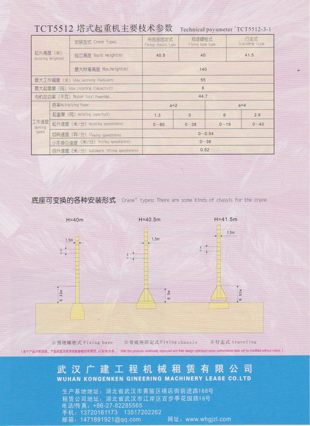该机最大臂长55m,最大起重量为6吨,额定起重力矩885KN.m,无塔帽平头型式,平头塔机装拆则简单、快捷、安全,非常适合于对高度有特殊要求的场合,多塔作业方便。