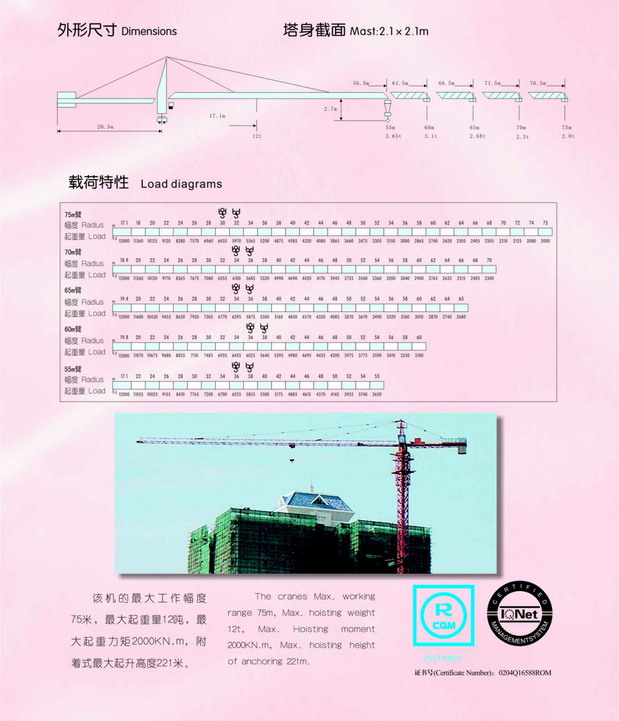 该机臂长为50~75m,最大起重量为12~16吨,额定起重力矩2800KN.m,起升高度高,工作幅度大,作业空间广,工作效率高,各项性能参数先进。